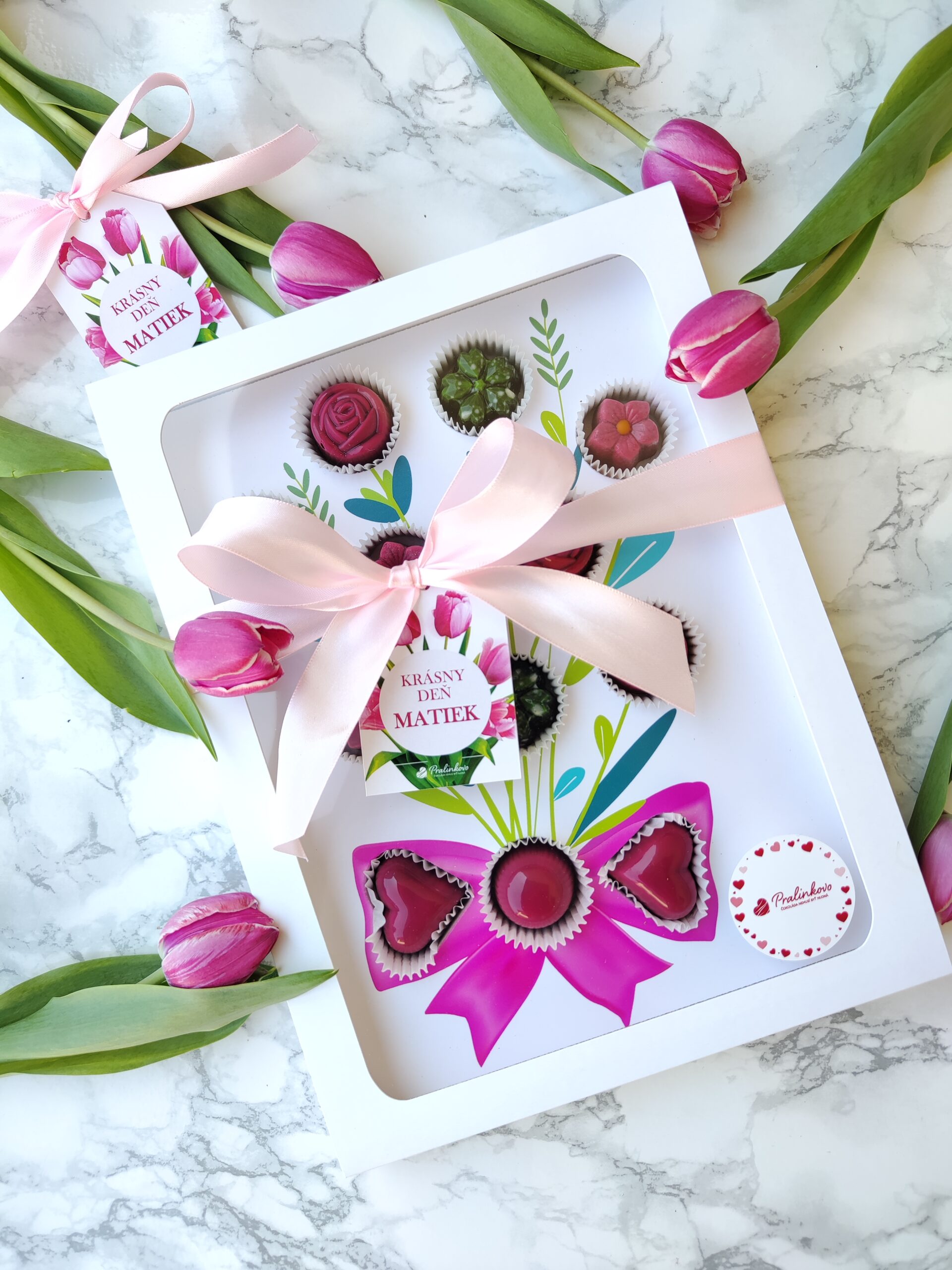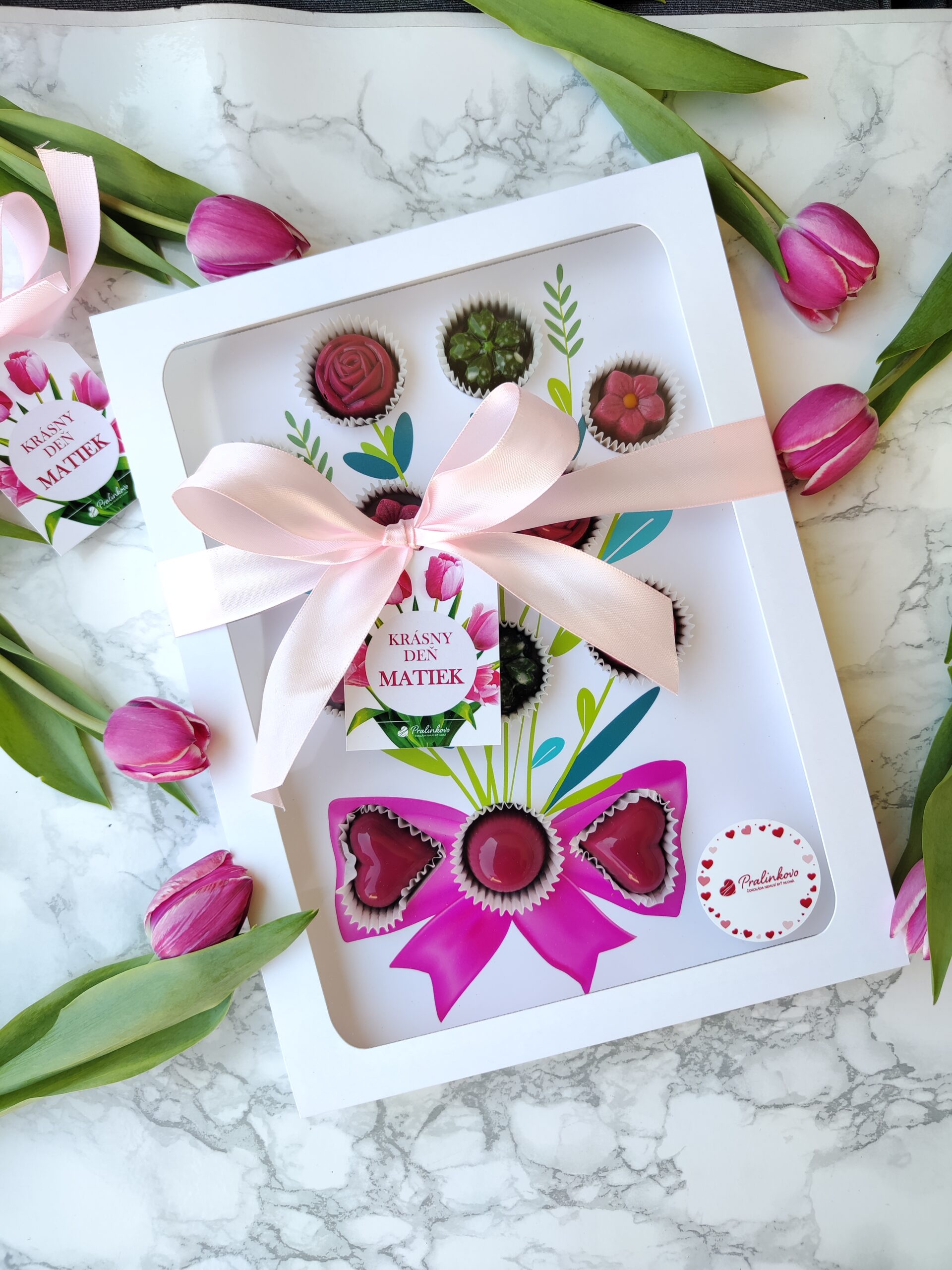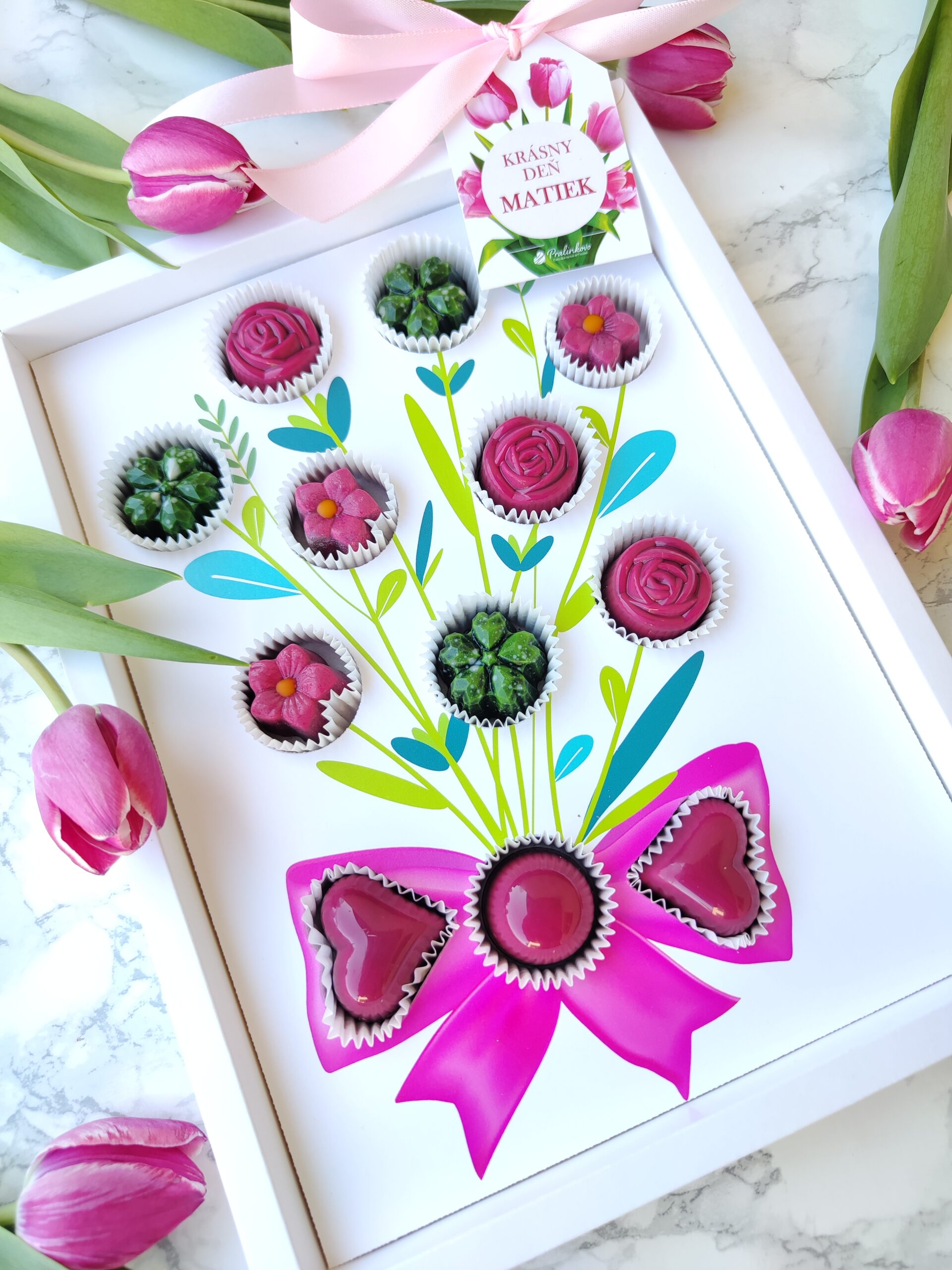 Krabička je dodávaná s priesvitným vekom previazaná stuhou s pripevnenou kartičkou ku dňu matiek (viď galéria).