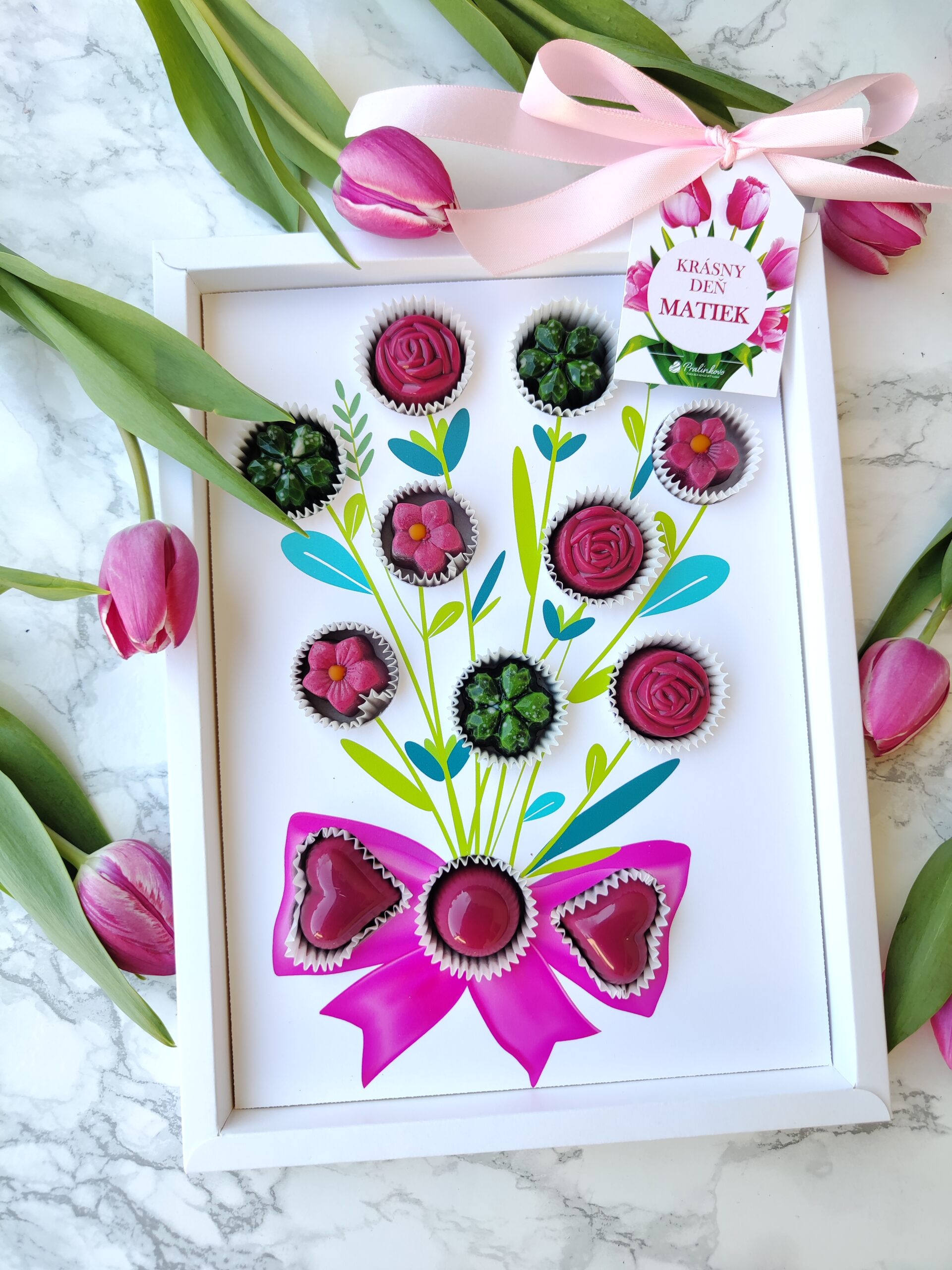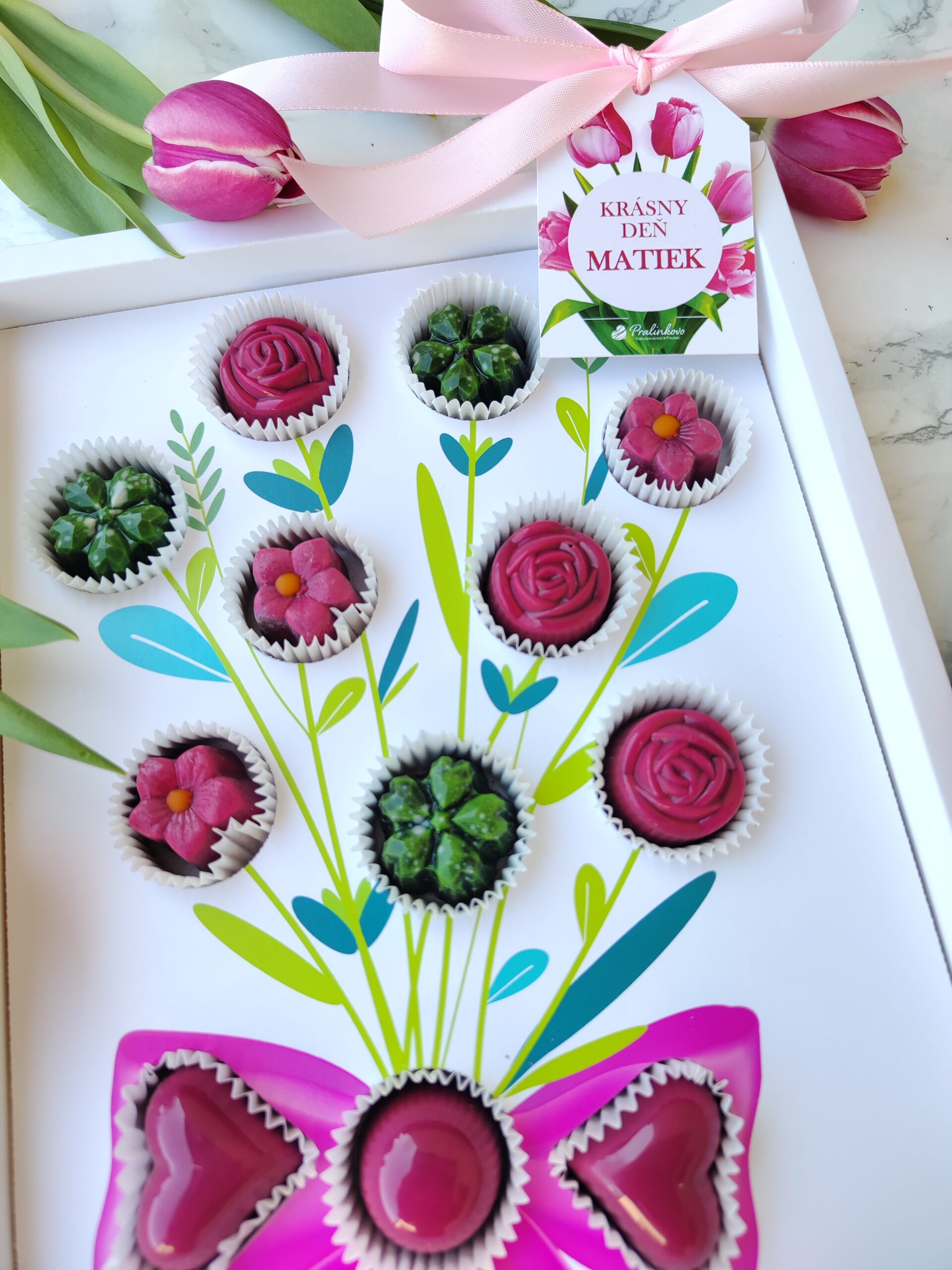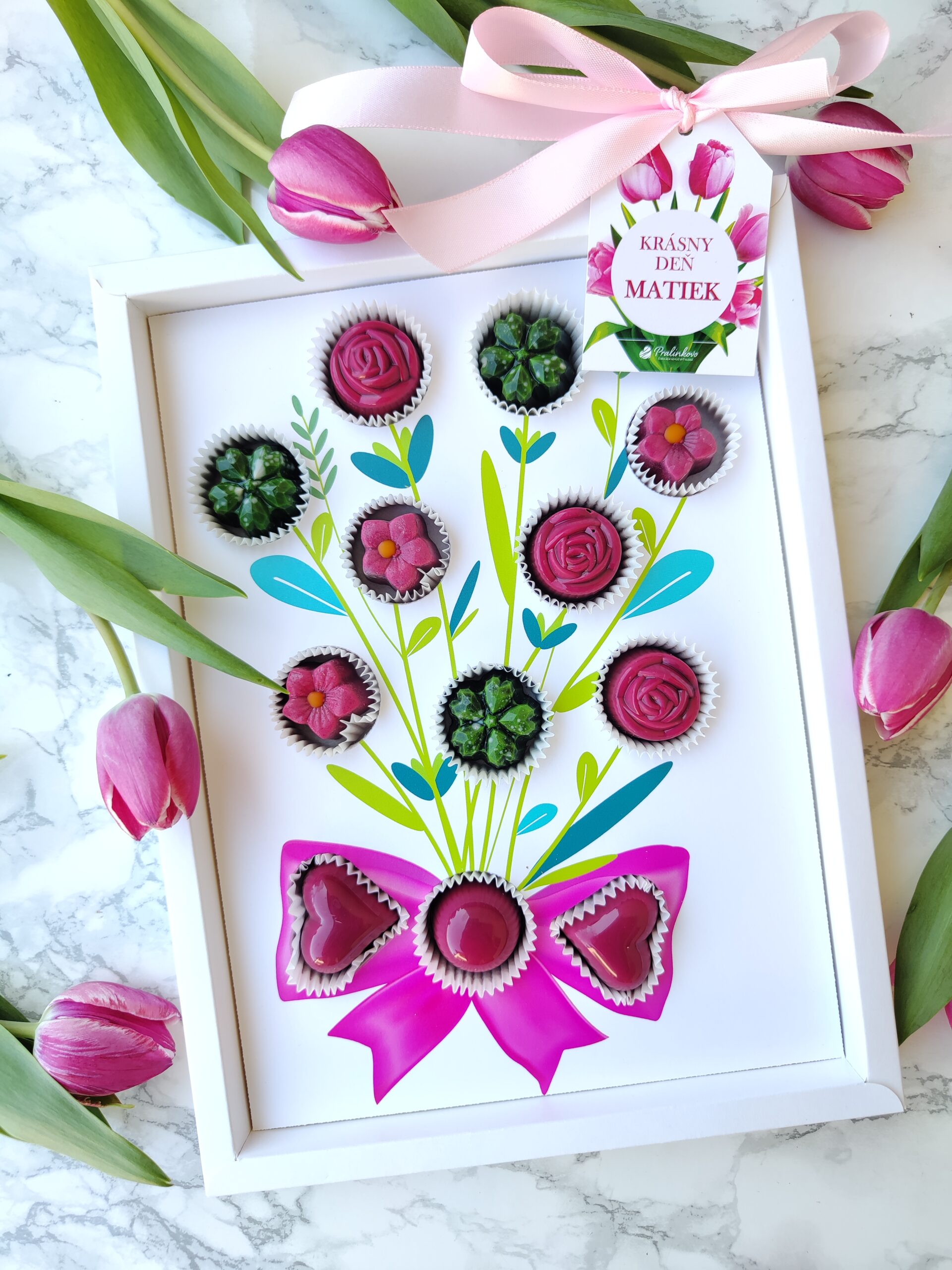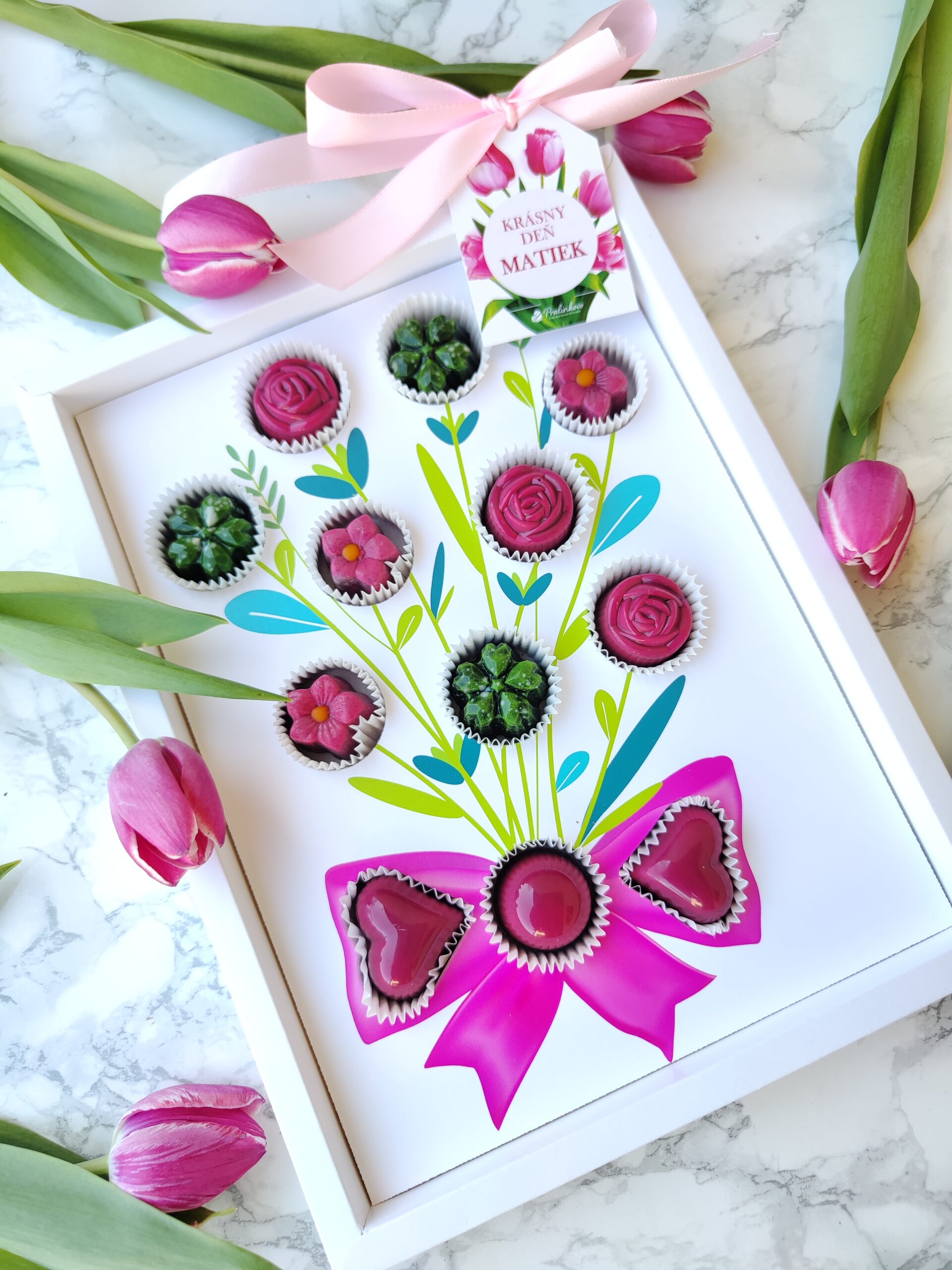 Krabička je dodávaná s priesvitným vekom previazaná stuhou s pripevnenou kartičkou ku dňu matiek (viď galéria).