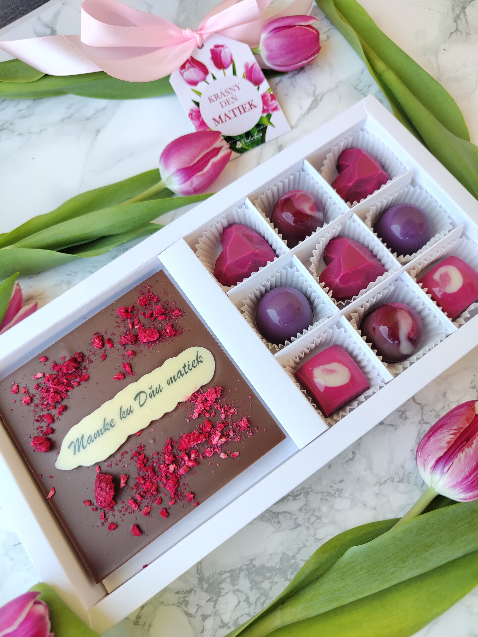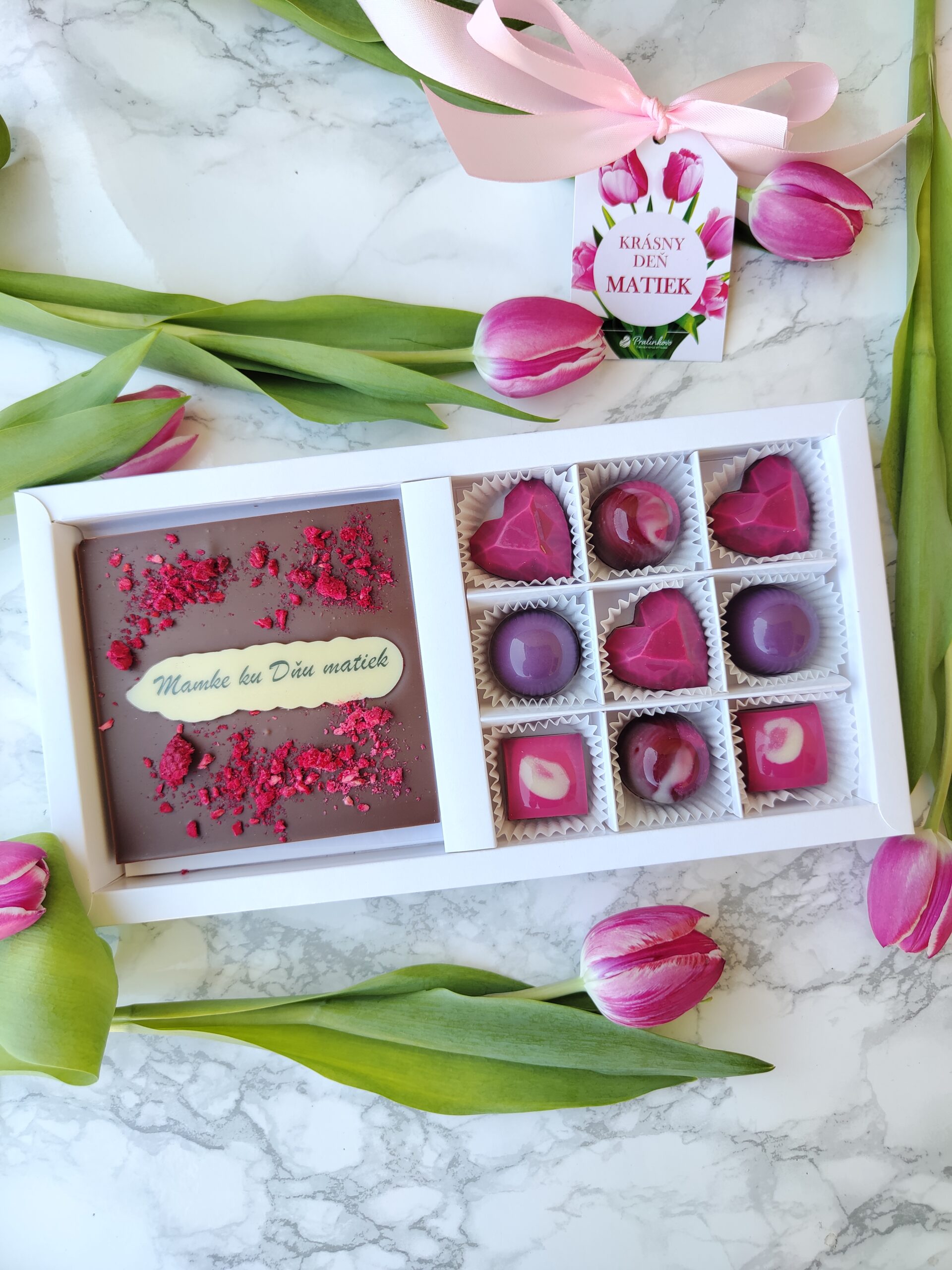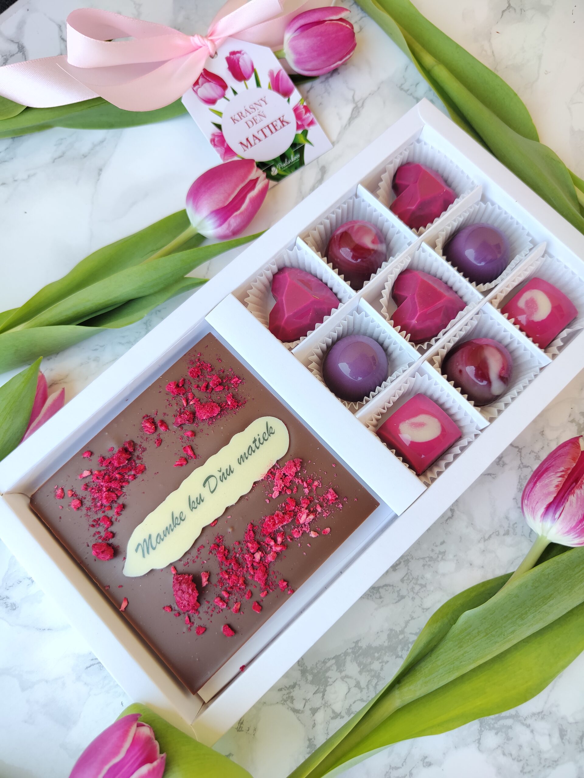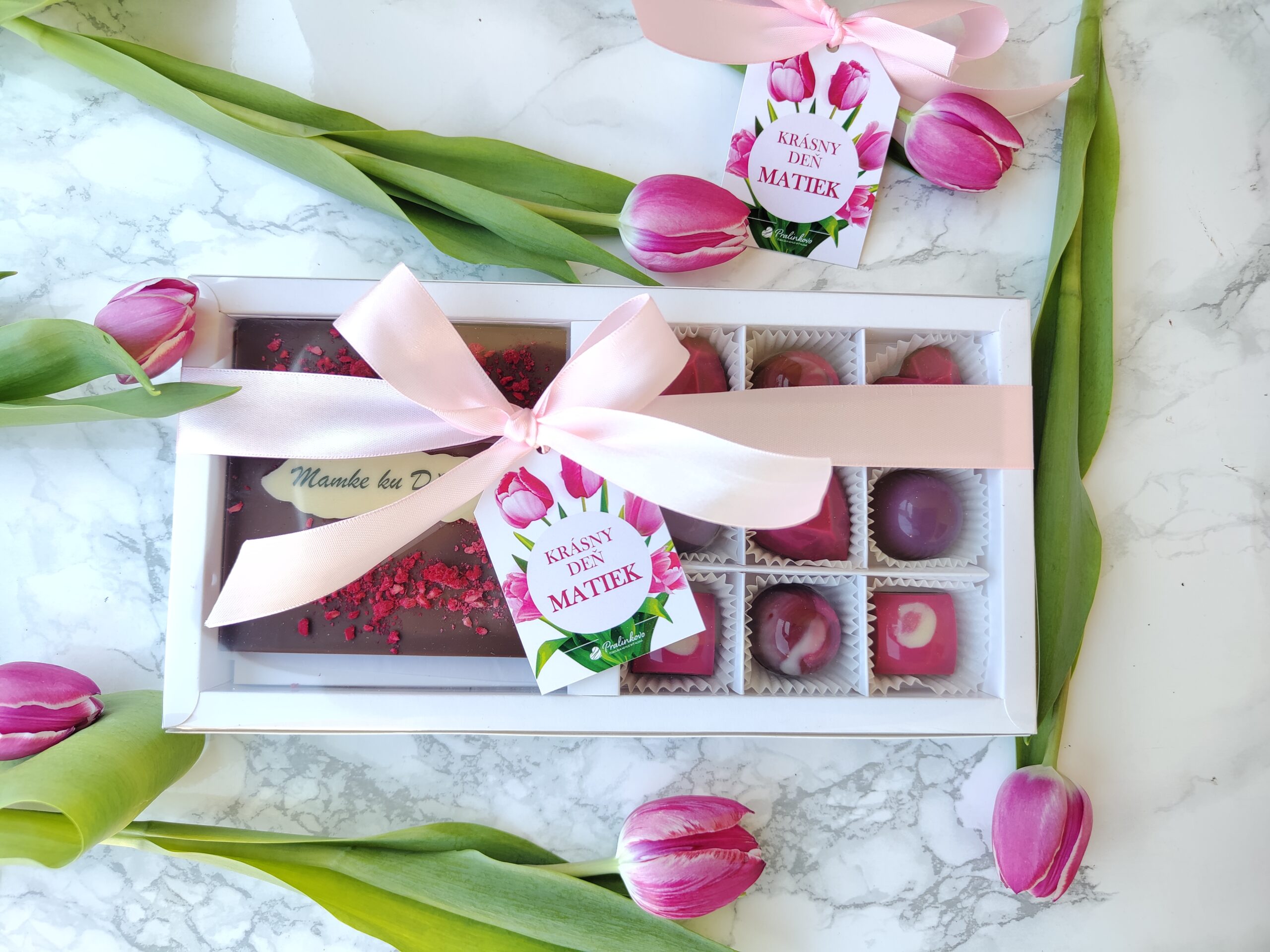 Krabička je dodávaná s priesvitným vekom s logom v dolnom rohu, previazaná stuhou s kartičkou ku Dňu matiek.